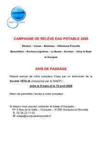 Le relevé annuel de votre compteur d’eau potable sera effectué par un technicien de la…