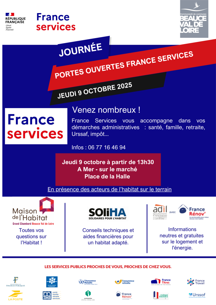 Une journée Portes ouvertes France Services se tiendra à Mer le jeudi 9 octobre 2025, à partir de 13h30. Cette initiative s’inscrit dans le cadre d’une mobilisation nationale visant à faire connaître les actions menées par l’ensemble des France Services.